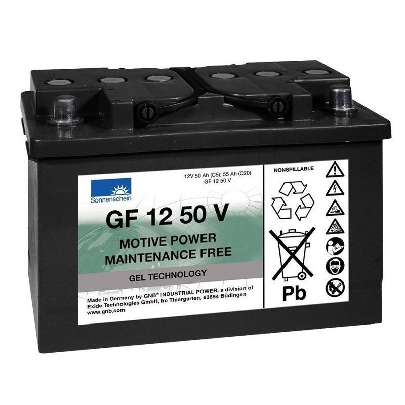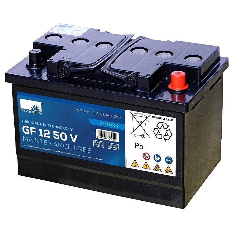 Тяговый аккумулятор Sonnenschein GF 12 050 V (ёмкость C5 50 Ач, напряжение 12 вольт) разработан с применением технологии GEL (или Dryfit — электролит загущен до желеобразного состояния), что обеспечивает повышенную устойчивость к температурам и глубоким разрядам. Он применяется в электромоторах с высокими требованиями к энергоёмкости, циклической выносливости и мобильности: яхты, лодки, инвалидные коляски, уборочная и складская техника. Батарея не требует обслуживания (долива воды) и отдельного помещения для зарядки. Главное отличие Sonnenschein GF 12 050 V от других тяговых аккумуляторов — повышенная безопасность. За это отвечает сверхпрочная конструкция корпуса из ABS пластика, отдельное внимание уделено искробезопасности.