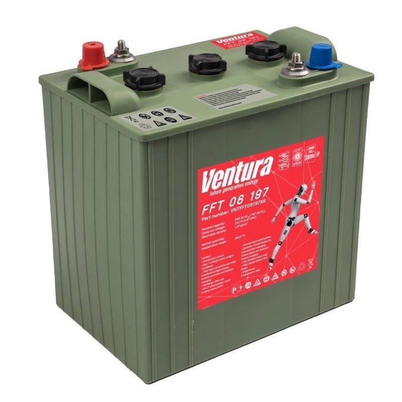 Ventura FFT 06 197 – тяговый моноблок с жидким электролитом и плосконамазными пластинами. Отличается ускоренным зарядом за счет низкого внутреннего сопротивления, быстрым выходом на номинальную емкость, а также весьма привлекательной стоимостью при солидном сроке службы не менее 1000 циклов заряд-разряд.
