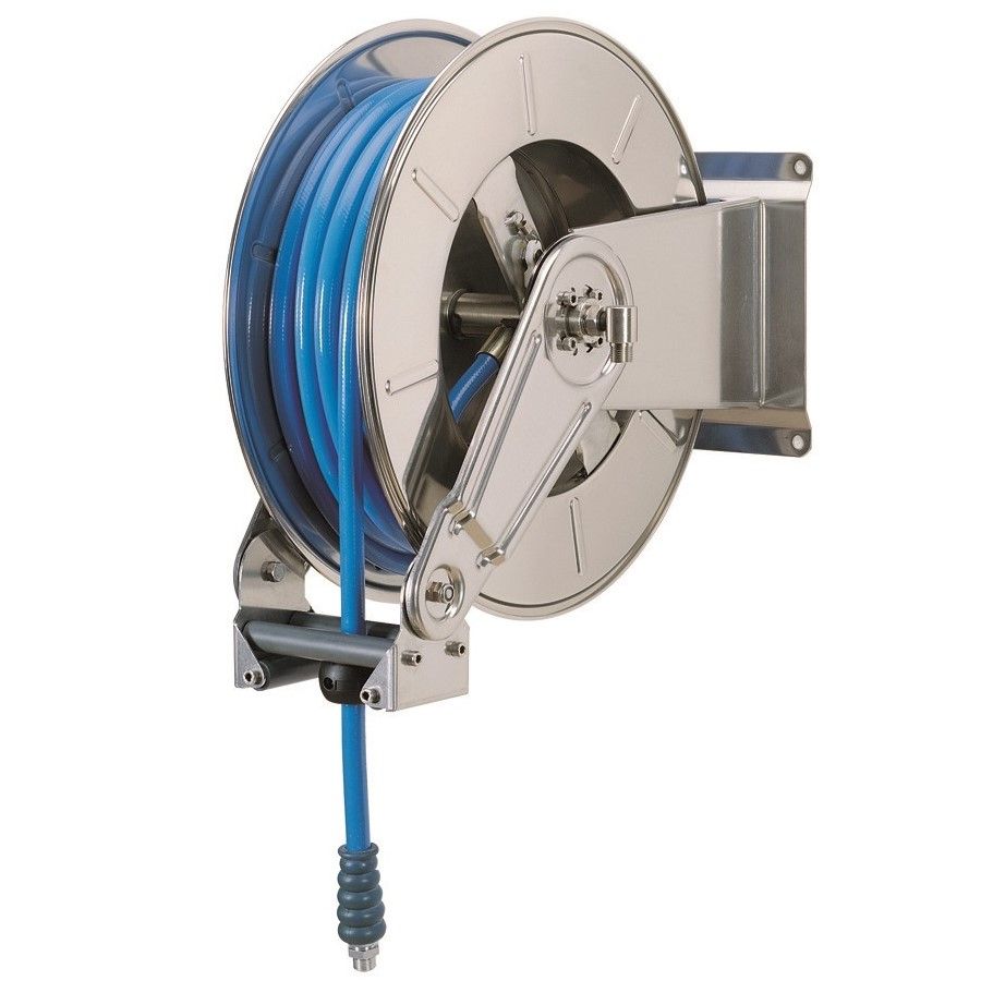 Катушка изготовлена из нержавеющей стали AISI 304, предназначена для использования в пищевой и химической промышленности, машиностроении, лабораториях и прочее. Механизм намотки шланга - инерционный или автоматический с пружинным приводом, намотка шланга на барабан происходит за счет энергии сжатой во время разматывания пружины. Самый распространенный тип привода: обеспечивает максимальное удобство работы, надежный и неприхотливый.