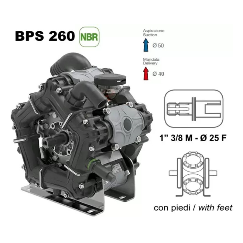 Comet ВPS 260 NBR40 - мембранный насос из новой серии "SPECIAL" с низким давлением, который разработан для удовлетворения потребностей клиентов в сфере сельского хозяйства и и коммунальном секторе. Эта новая линейка насосов предлагает передовые технологии и обладает превосходными техническими характеристиками. Серия BPS отличается оптимизированным соотношением хода и диаметра отверстия, что позволяет сократить размеры насоса и увеличить его срок эксплуатации благодаря использованию более широких мембран.