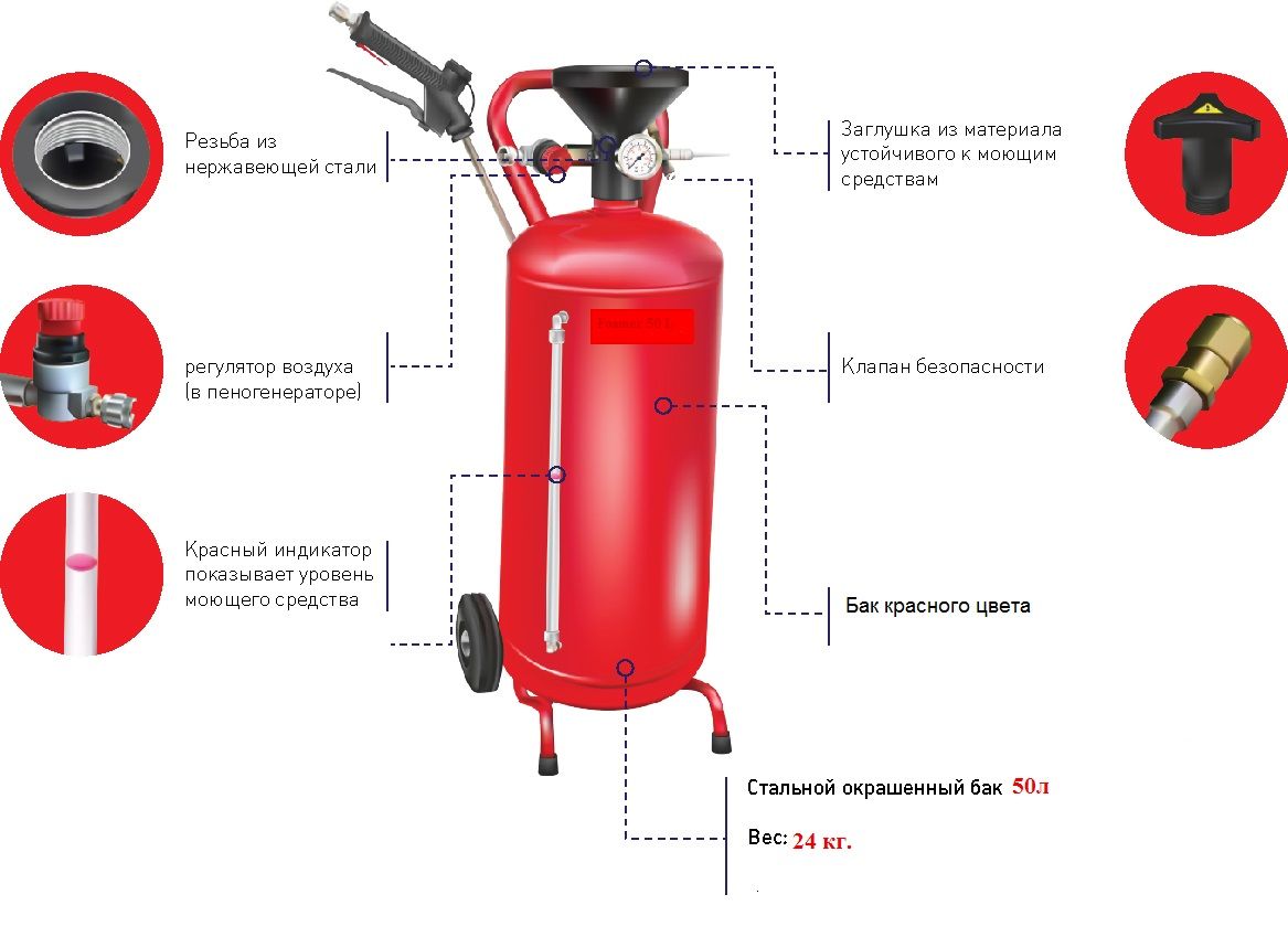 Пеногенератор емкостью 50 литров подходит для нанесения чистящий и дезинфицирующих средств в различных отраслях пищевой и перерабатывающей промышленности. Для работы в бак заливается готовый, то есть разведенный, химический состав. После этого пенный раствор с помощью пистолета наносится на обрабатываемую поверхность.