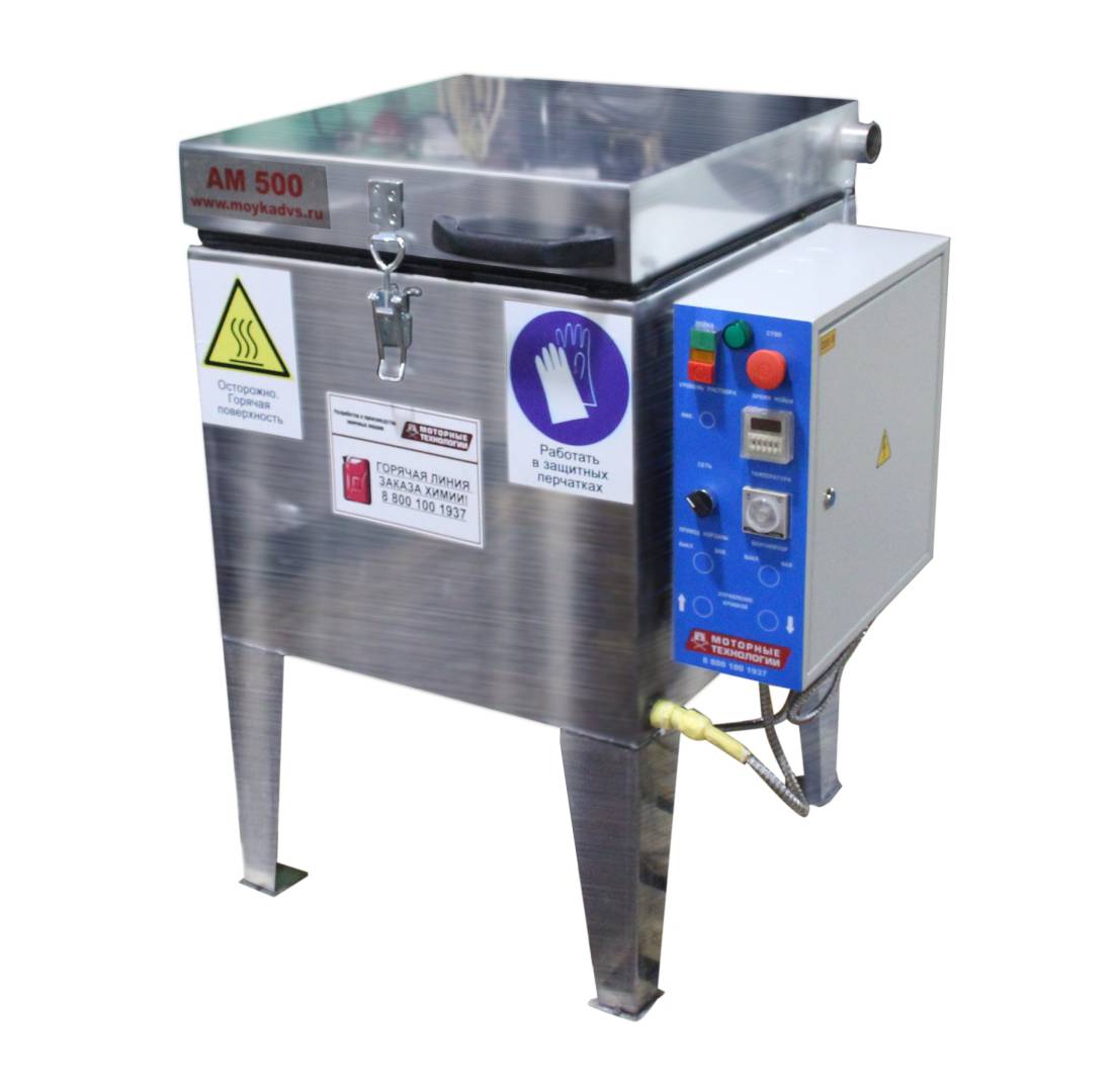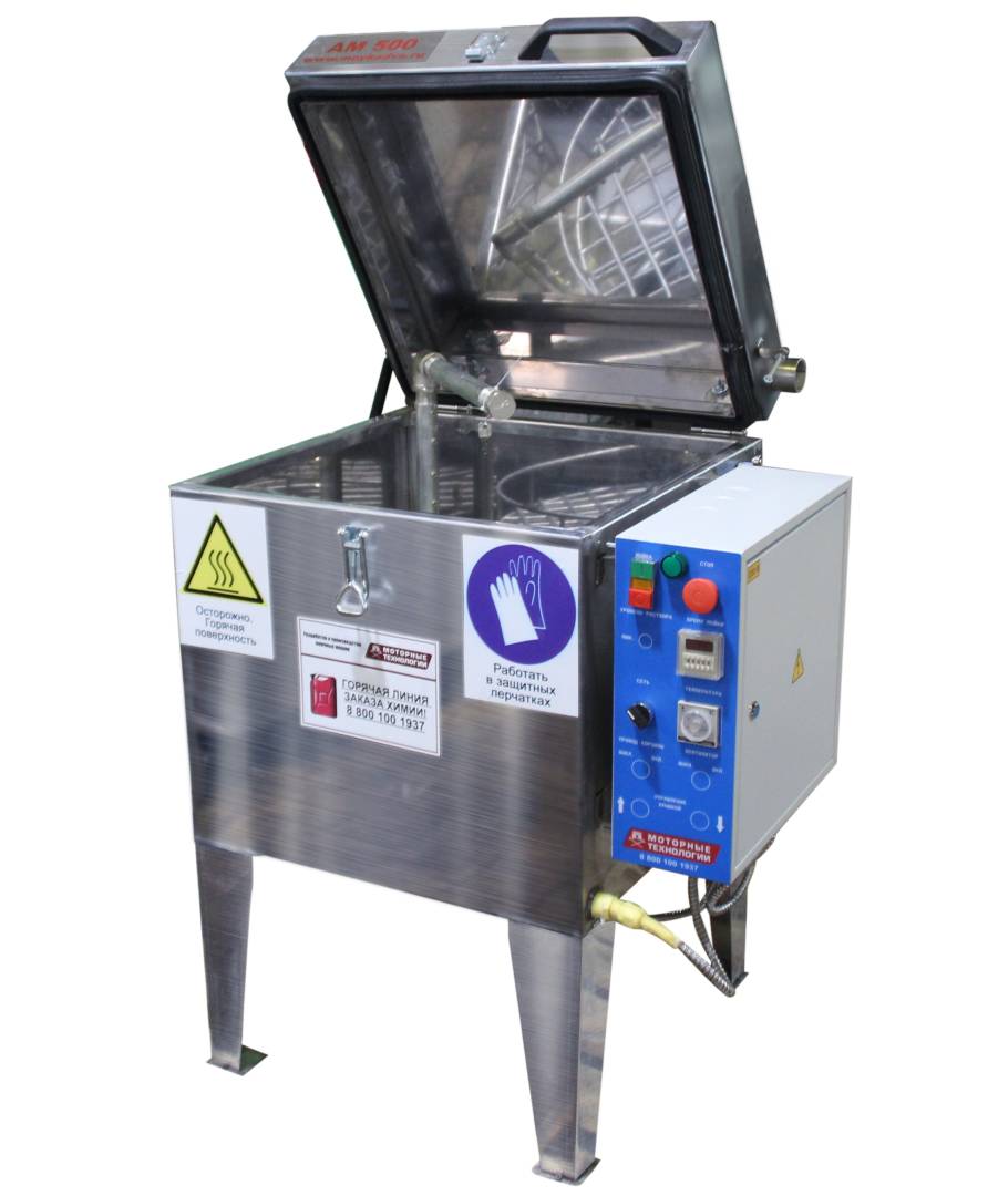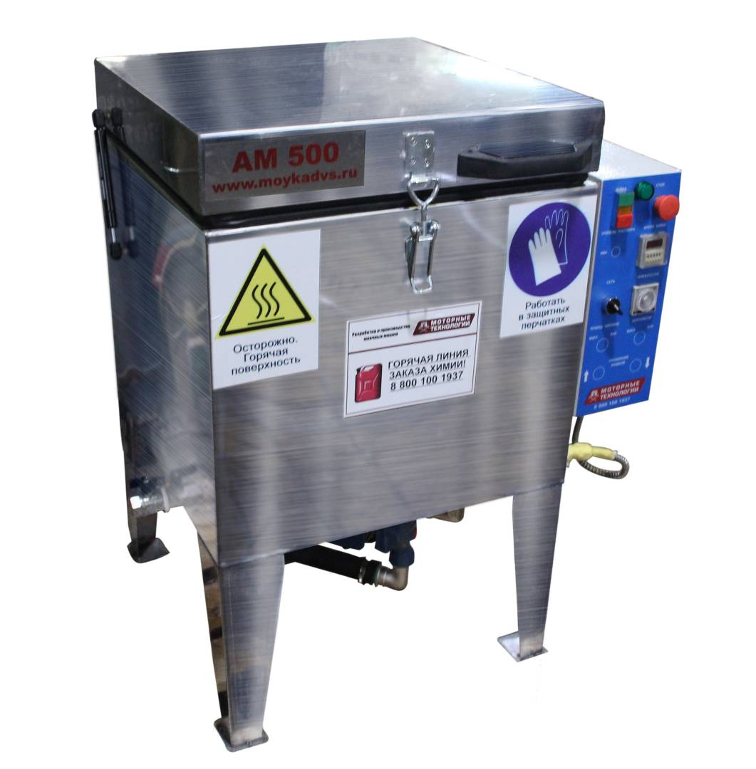 Серия AM500 ЭКО оснащена корзиной с диаметром 500 мм, высотой рабочего пространства 300 мм и грузоподъёмностью 80 кг, насосом мощностью 0,6 кВт и давлением 2,5-3 бар, баком из нержавеющей стали AISI 430 толщиной 2 мм и объёмом 60 литров, корзиной грузоподъёмностью 80 кг, электромеханическим приводом вращения корзины, аналоговой системой контроля температуры, цифровым реле времени и системой аварийного останова.
