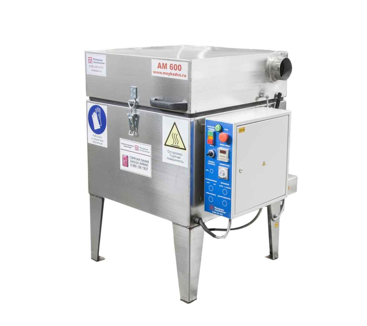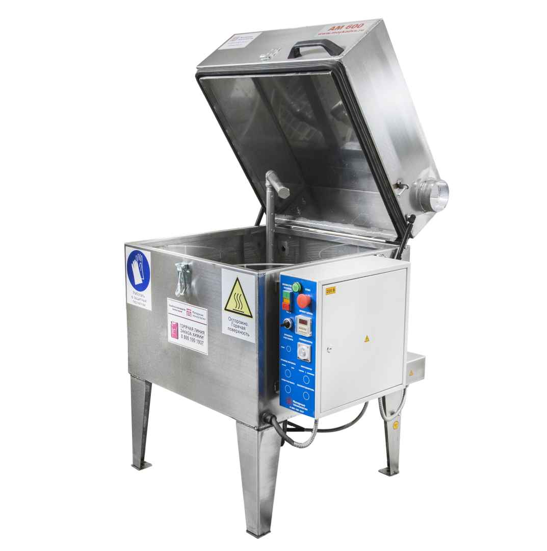 Серия AM600 ЭКО комплектуется насосом мощностью 0,6 кВт и давление 2,5-3 бар, корзиной диаметром 600 м, высотой рабочего пространства 350 мм и грузоподъёмностью 80 кг, баком из нержавеющей стали толщиной 2 мм и объёмом 75 л, аналоговой системой контроля температуры, цифровым реле времени и системой аварийного останова.