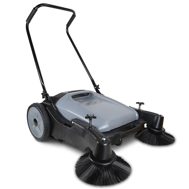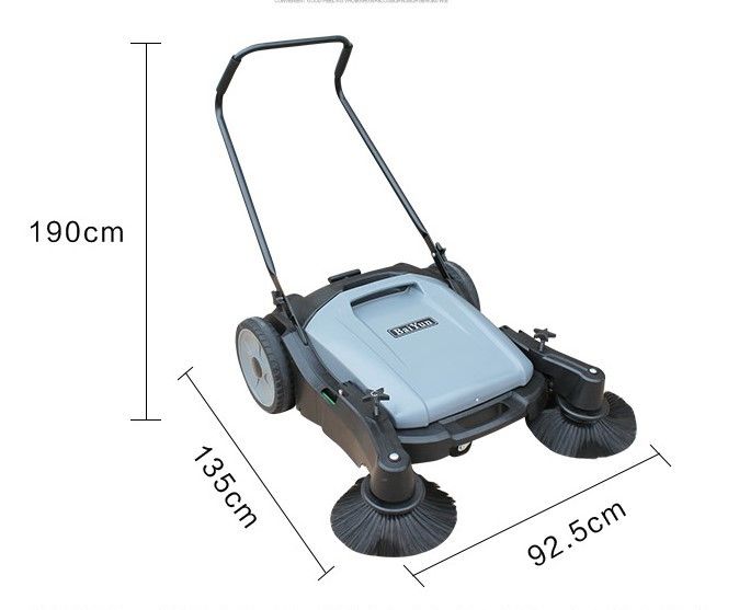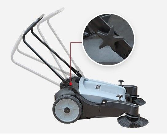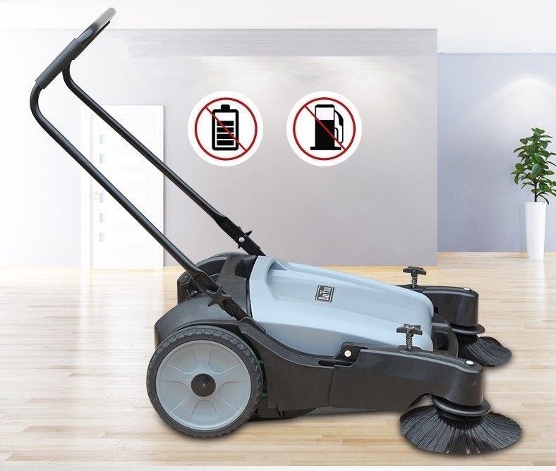 Подметальная машина Baiyun A70 - ручная машина для подметания, модель с механическим приводом, которой приводится в движение толканием. Вращающееся колесо двигает ремень, ремень вращает щетку валика и боковые щетки, которые подметают поверхность и собирают мусор в емкость для мусора.