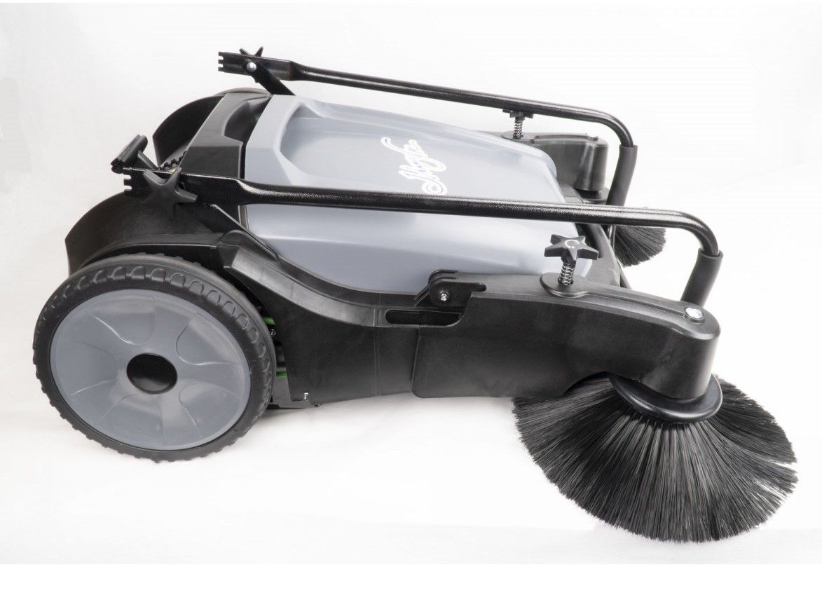 Боковые щетки устроены таким образом, что сметают мусор в рабочую область щетки валика. Затем, щетка валика собирает мусор в емкость для мусора. Боковые щетки очень эффективны при подметании углов. Для удобства эксплуатации, конструкция ручки управления позволяет ее установить в трех положениях.