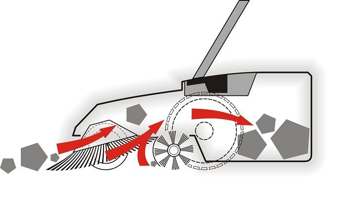 • Плавная регулировка угла наклона щеток позволяет настроить оптимальный угол наклона, благодаря чему щетки буквально "подрезают" мусор снизу и забрасывают в контейнер