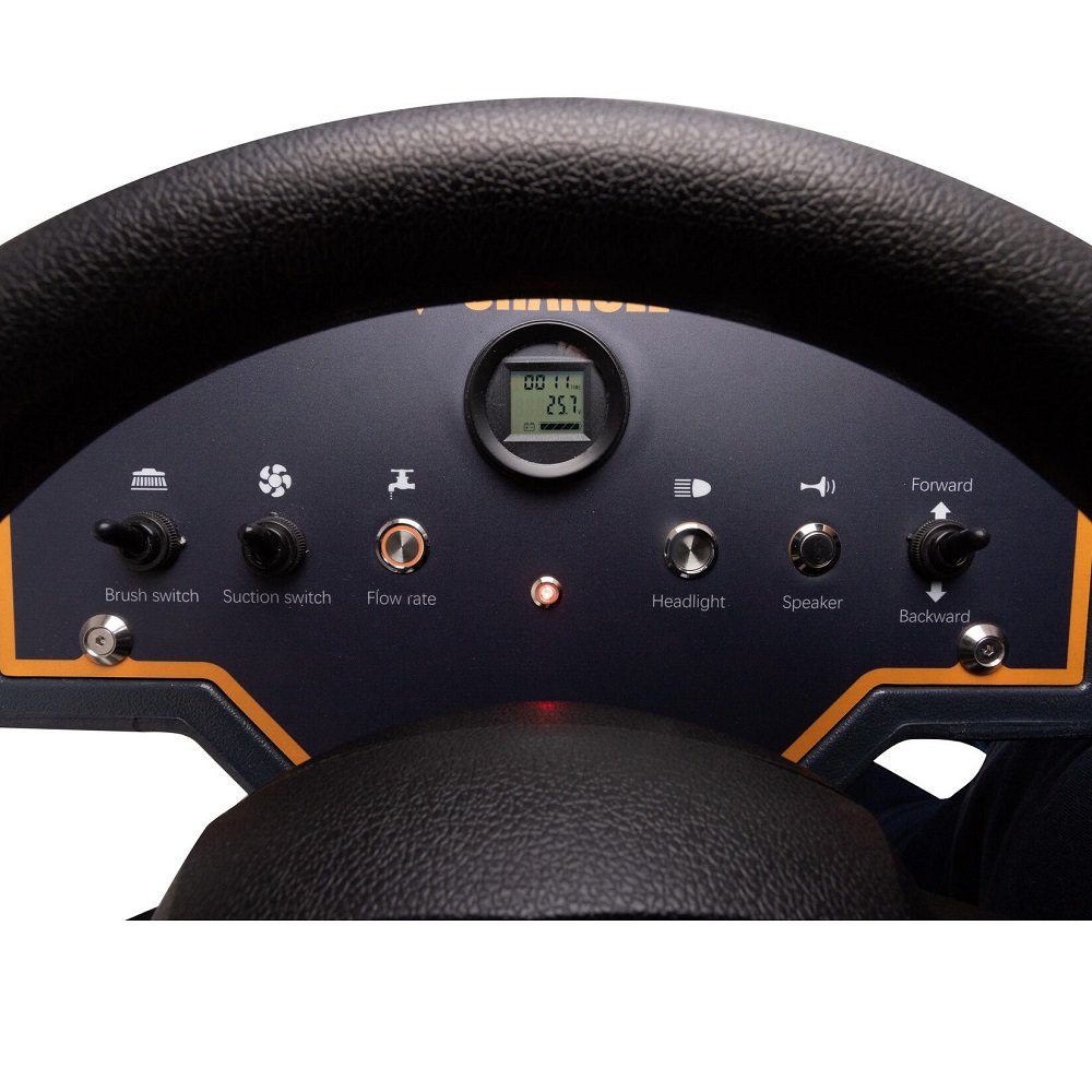 Специальное рулевое колесо, интеллектуальная панель управления, ручки для подъема всасывающей балки и щеточного узла, а также система оповещения об уровне воды в баке значительно облегчают работу и делают её удобнее и безопаснее. Резервуары и аккумуляторы большой емкости позволяют этой самоходной машине работать в течение длительного времени и, таким образом, делают её пригодной для использования в различных больших помещениях.