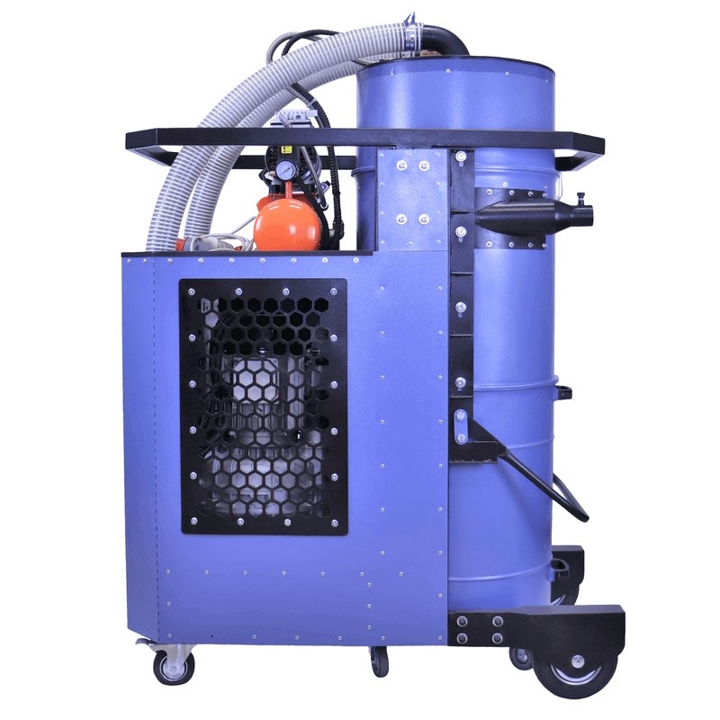 Дастпром ПП-380/110.1-4 - промышленный пылесос с мусорным баком 110 литров и циклонной технологией фильтрации загрязнений с системой автоматической пневмоочистки HEPA фильтров. Для увеличения срока службы плавные запуск и остановка осуществляются с помощью частотного преобразователя, а перегрузка по силе всасывания контролируется защитным пружинным клапаном. Циклонная технология фильтрации в совокупности с 3 HEPA фильтрами позволяет собирать любые невзрывоопасные виды загрязнений в разной пропорции и фракции. Для удобной замены фильтров предусмотрены быстросъёмные пневматические и электрические соединения.