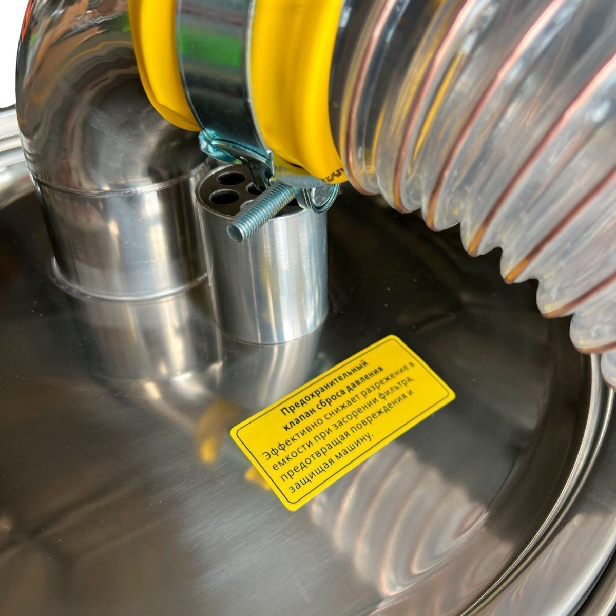 Конструкция модели отличается практичностью и долговечностью: шасси и корпус выполнены из нержавеющей стали, а съемный бак объемом 100 литров установлен на собственном шасси для удобства транспортировки и опорожнения. Фильтрующая система площадью 32000 кв. см включает моющийся фильтрующий элемент из материала FPPR с точностью фильтрации 0,3 мкм. Усовершенствованная долговечная турбина обеспечивает постоянное всасывание и низкий уровень вибрации, а предохранительный клапан защищает систему от избыточного давления. Эргономичная конструкция с задним отсеком для аксессуаров и возможностью регулировки диаметра всасывающего отверстия от 50 до 100 мм делает пылесос идеальным решением для различных отраслей промышленности.